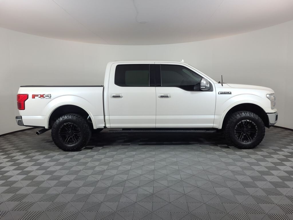 BLIND SPOT MONITORING SYSTEM, NAVIGATION SYSTEM, TWIN PANEL MOONROOF, LEATHER, REARVIEW CAMERA SYST, FX4 OFF-ROAD PACKAGE, BLUETOOTH HANDS FREE, CRUISE CONTROL, DUAL FACTORY AIR, HTD/COOLED SEAT PKG, HEATED STEERING WHEEL, HTD MIRRORS, PREMIUM WHEELS/TIRES, PARKING SENSORS, POWER ADJUSTABLE PEDALS, POWER SLIDING REAR WINDOW, PREMIUM AUDIO, POWER FOLDING SIDE MIRRORS, RUNNING BOARDS, REMOTE START, REAR HEATED SEATS, SYNC 3, 36 GALLON FUEL TANK, KEYLESS ENTRY, PRO TRAILER BACKUP ASSIST, LARIAT CHROME APPEARANCE PKG, INTEGRATED TRAILER BRAKE CONTROLLER, TAILGATE STEP, TRAILER TOW PACKAGE, 4WD. White Platinum Metallic Tri-Coat 2018 Ford F-150 Lariat 4WD 10-Speed Automatic 3.5L V6 EcoBoost
